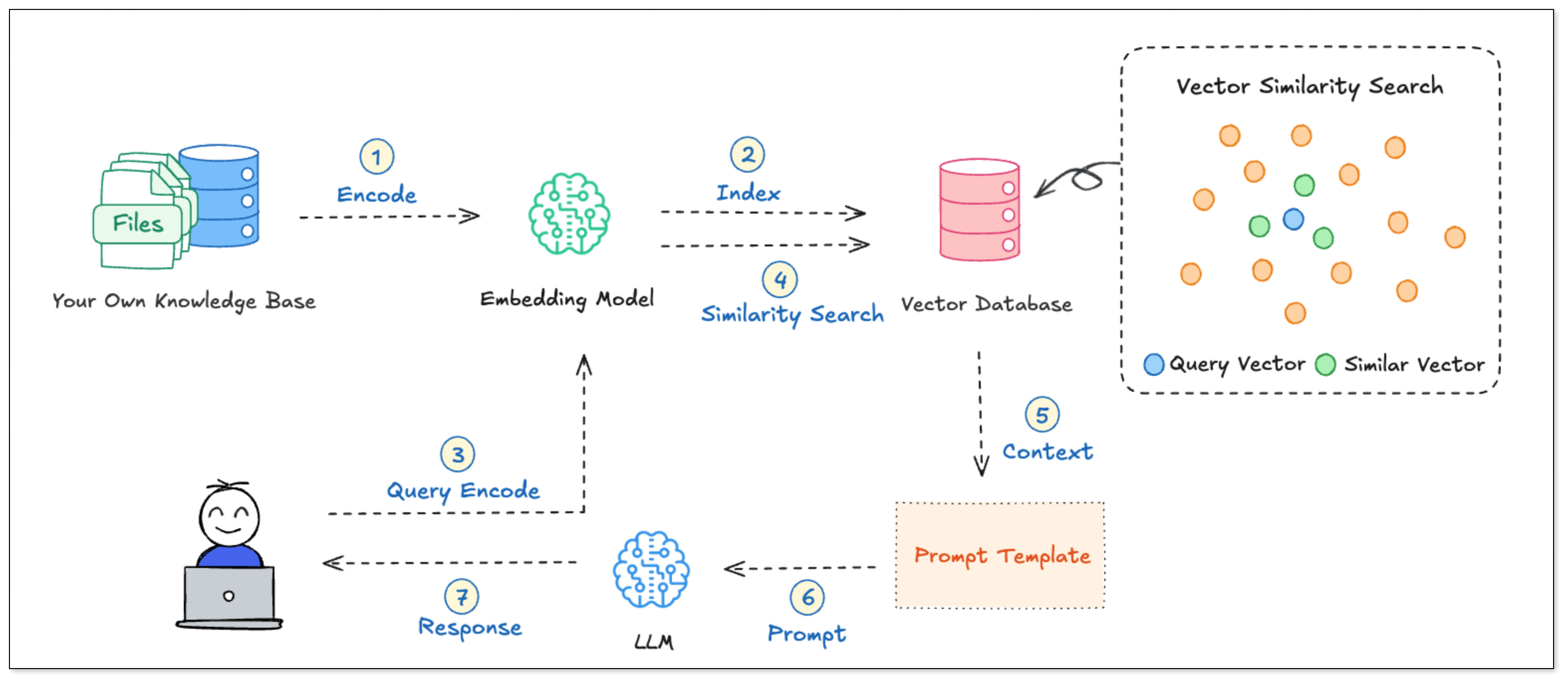 - 构建知识库:准备并处理大量文本资料,将其转化为向量表示(Vector Embeddings),并存储到向量数据库中(例如 PGVector)。