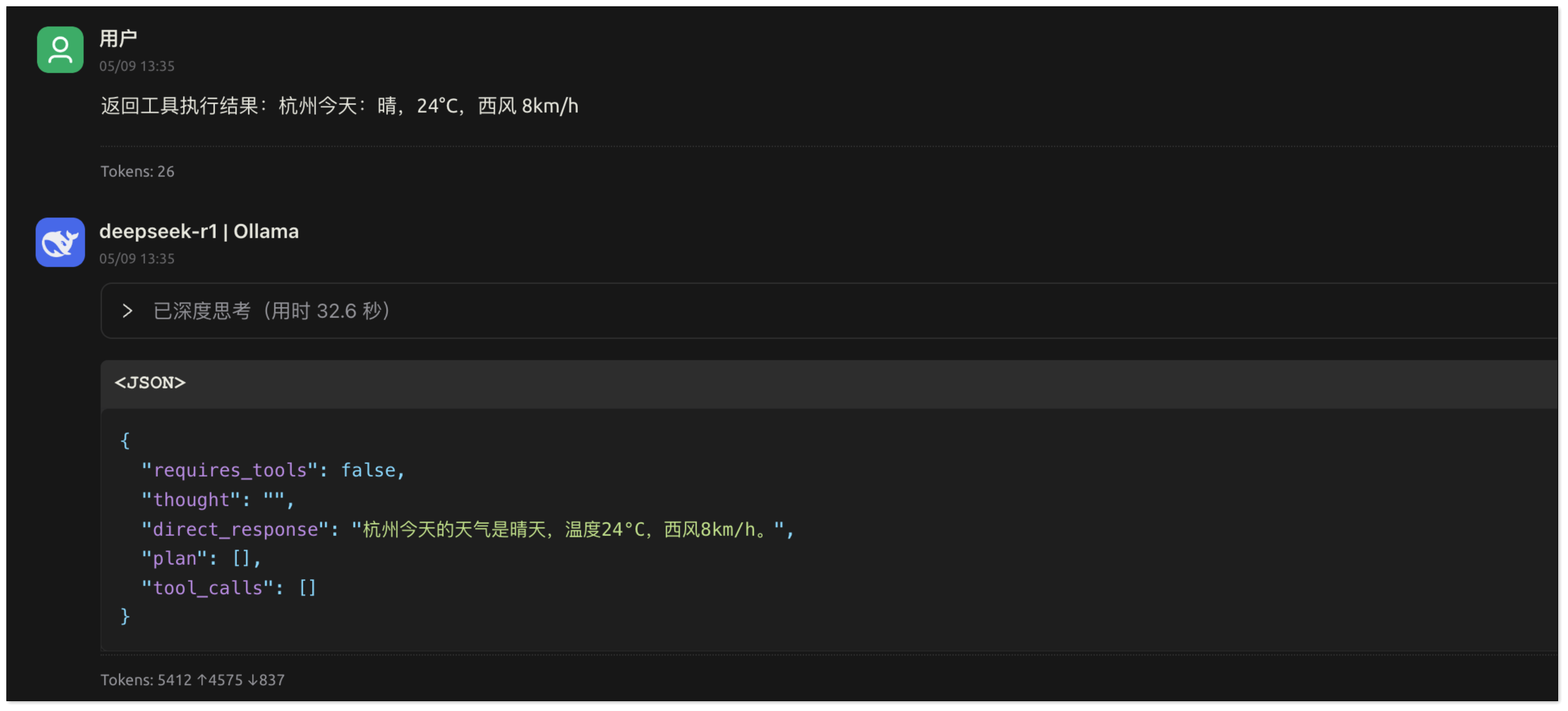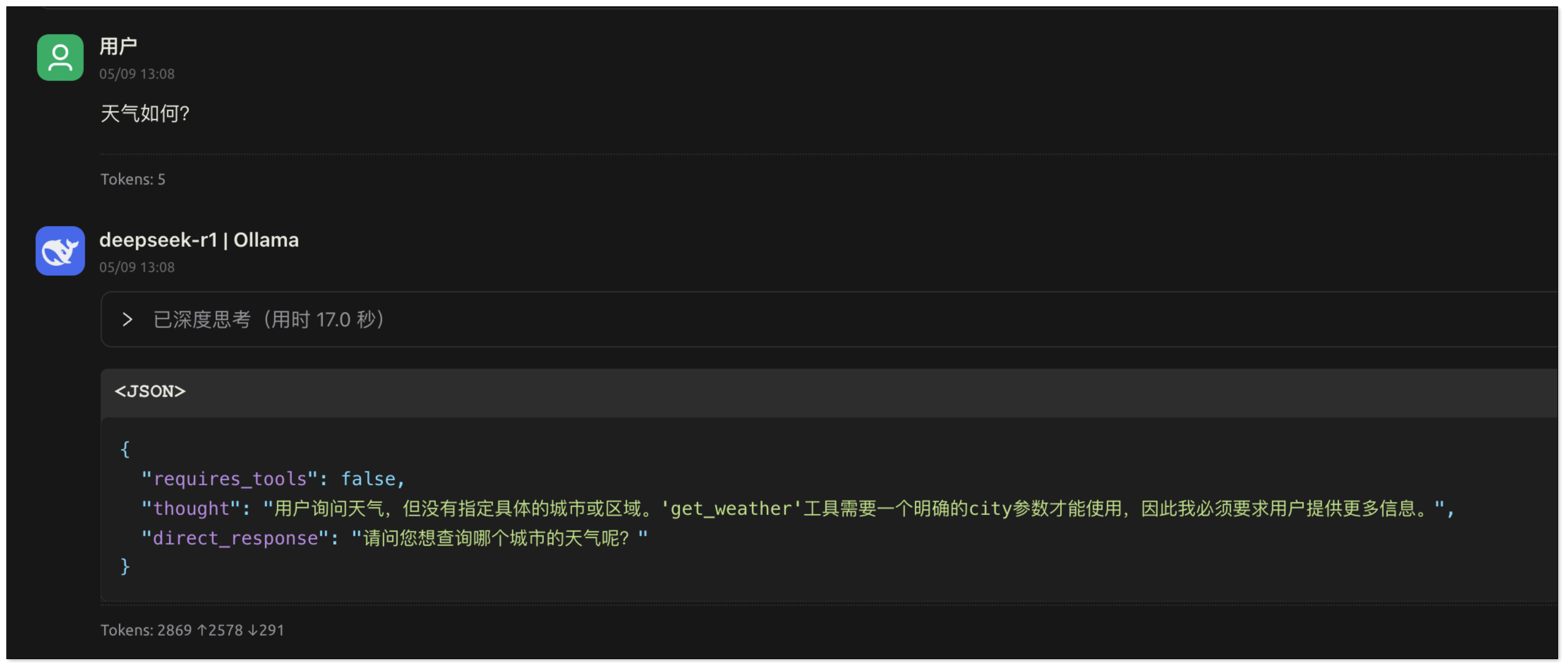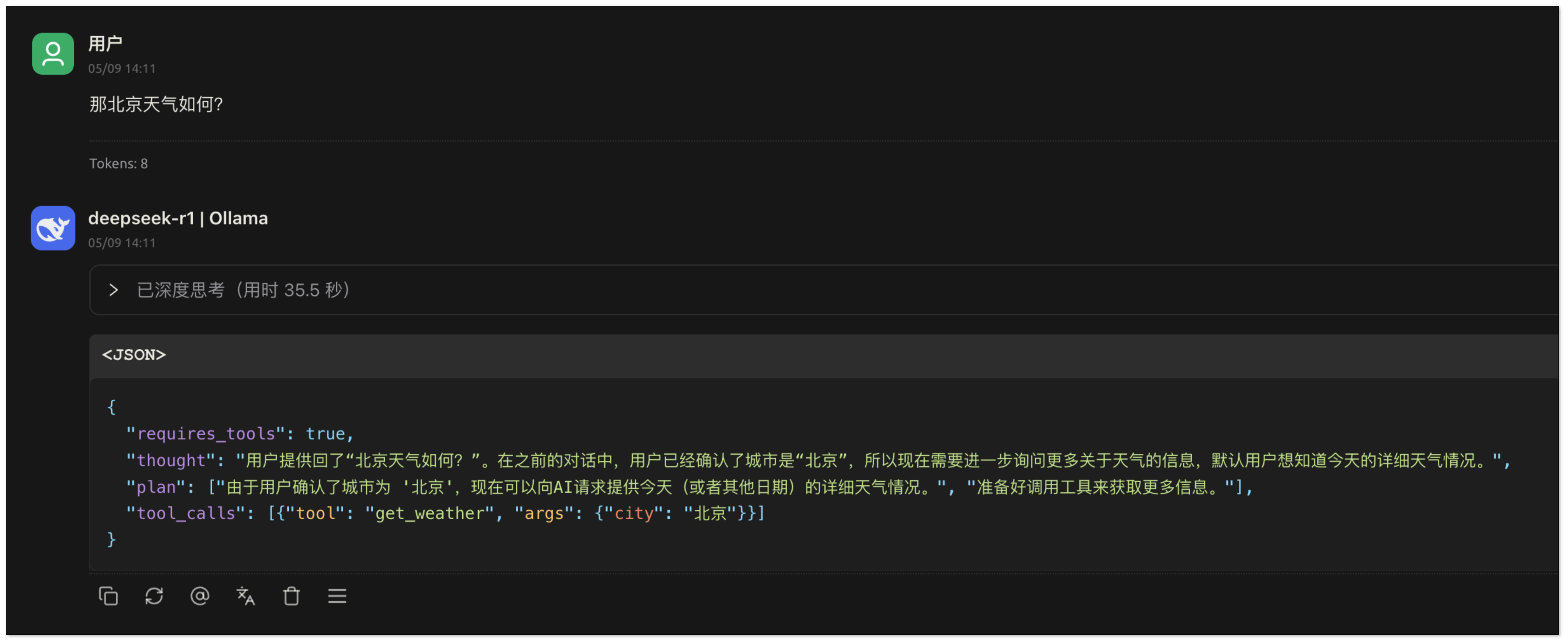 get_weather这个工具来获取天气信息。 - 生成调用指令:输出一个 JSON 对象,其中包含一次对