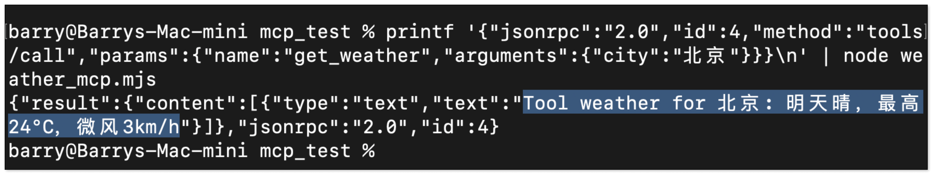 printf '{"jsonrpc":"2.0","id":4,"method":"tools/call","params":{"name":"get_weather","arguments":{"city":"北京"}}}\n' | node weather_stdio.mjs